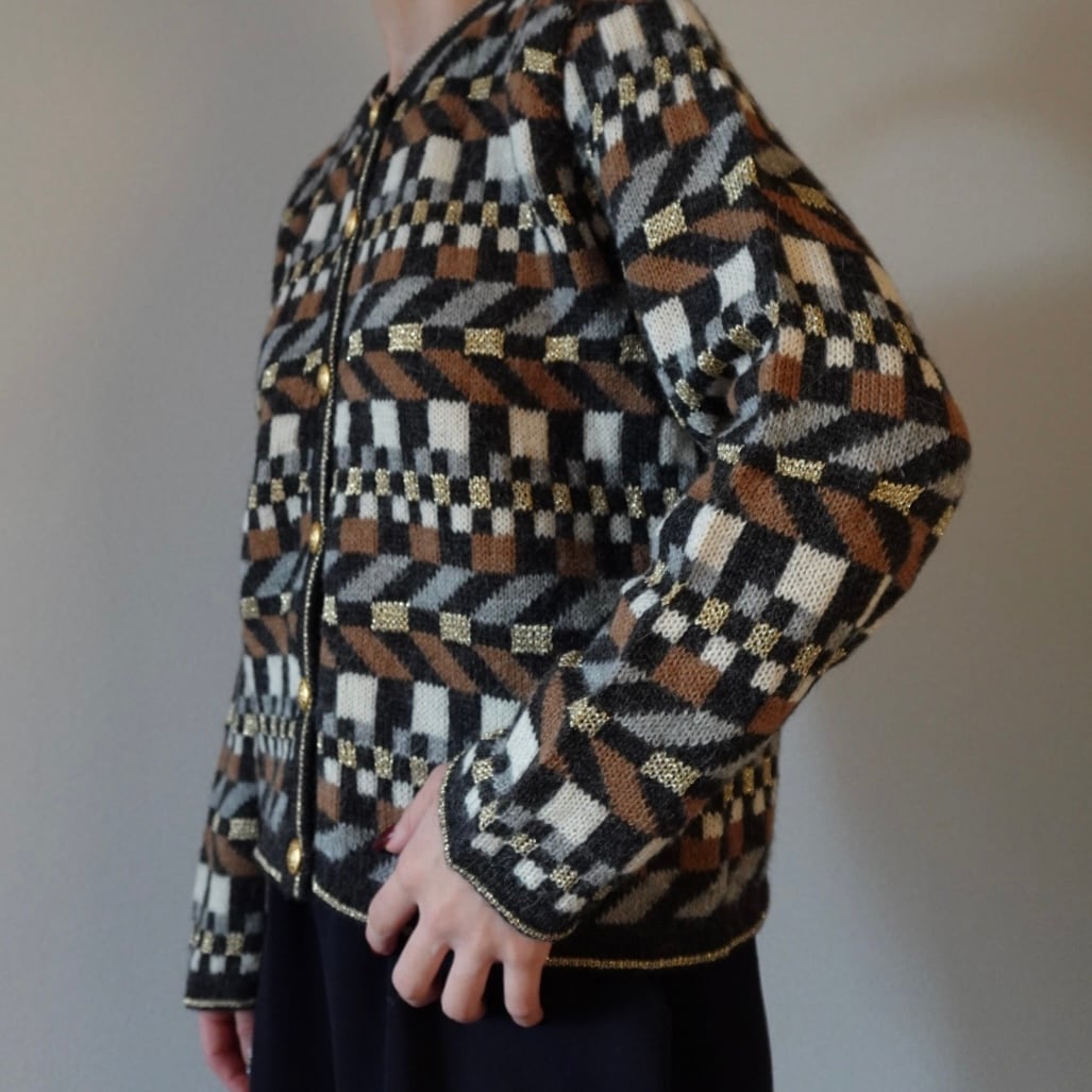 幾何学模様に金のボタンがアクセントになったカーディガン。